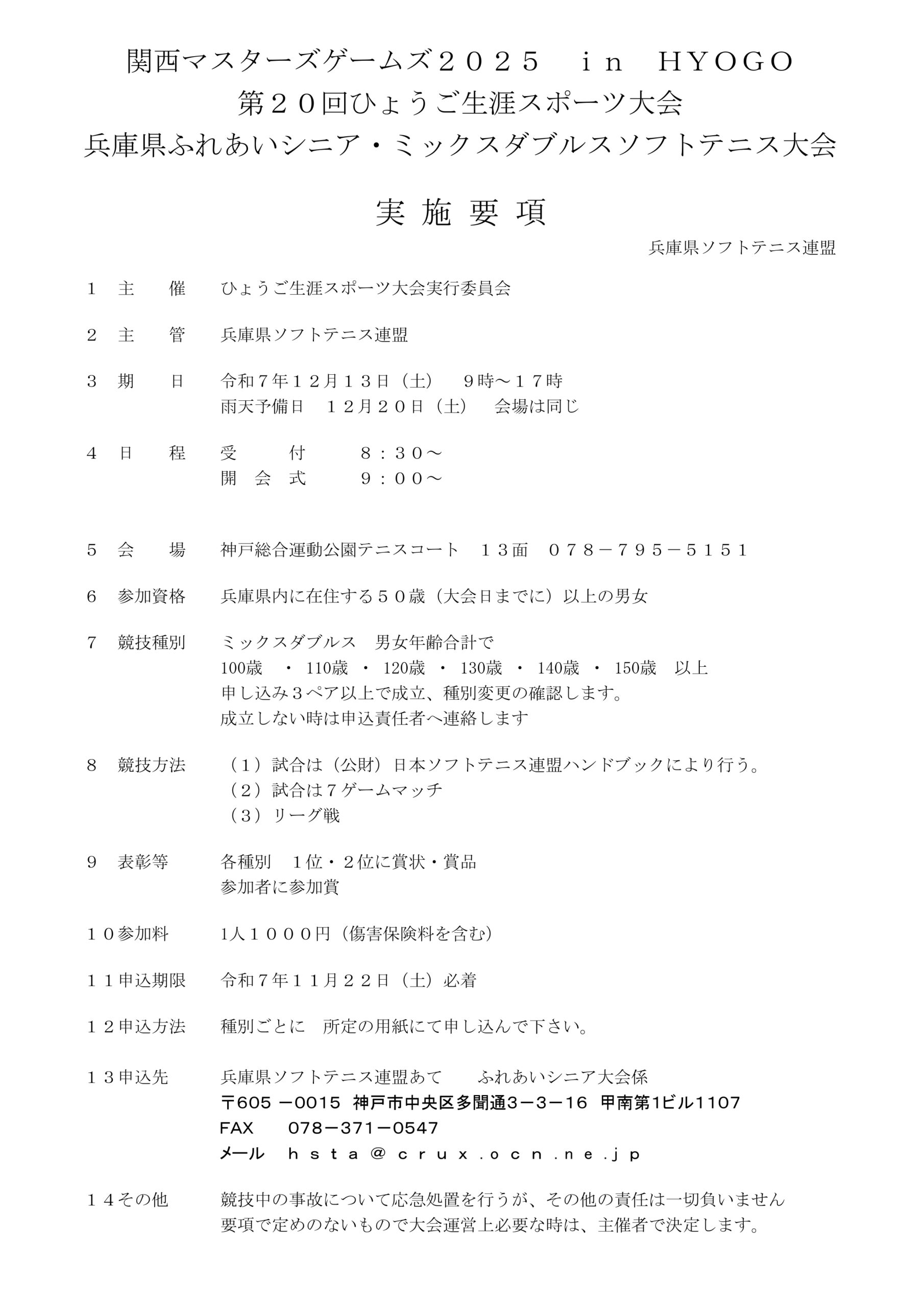 【11/22申込締切】兵庫県ふれあいシニア・ミックスダブルスソフトテニス大会 実施要項 2025年10月13日 最終更新日時 : 2025年10月13日 サイト管理者 R07兵庫県ふれあいシニア・ミックスダブルスソフトテニス大会 要項 R07ふれあいシニア申込書