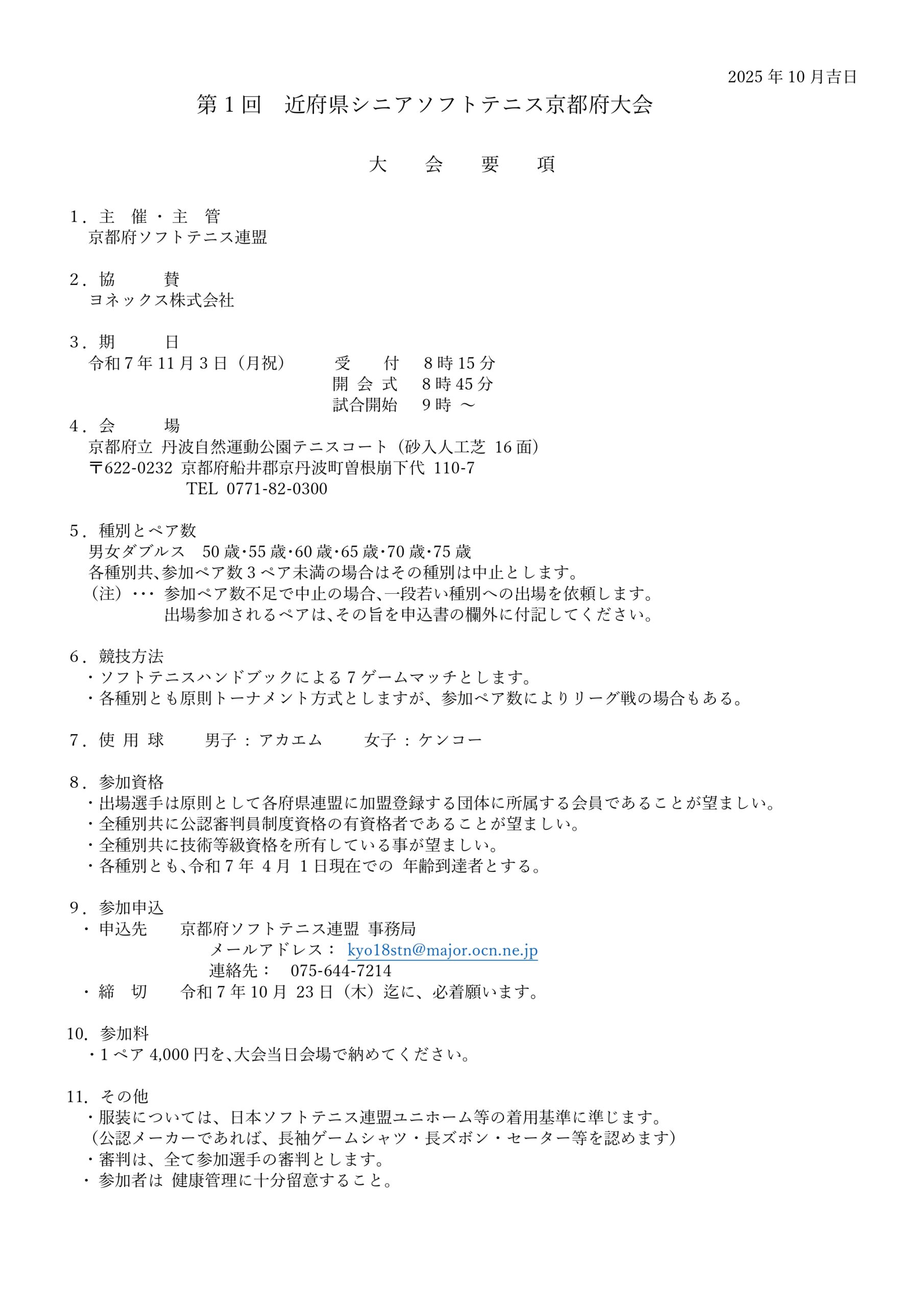 【京都府連からのご案内】第1 回 近府県シニアソフトテニス京都府⼤会