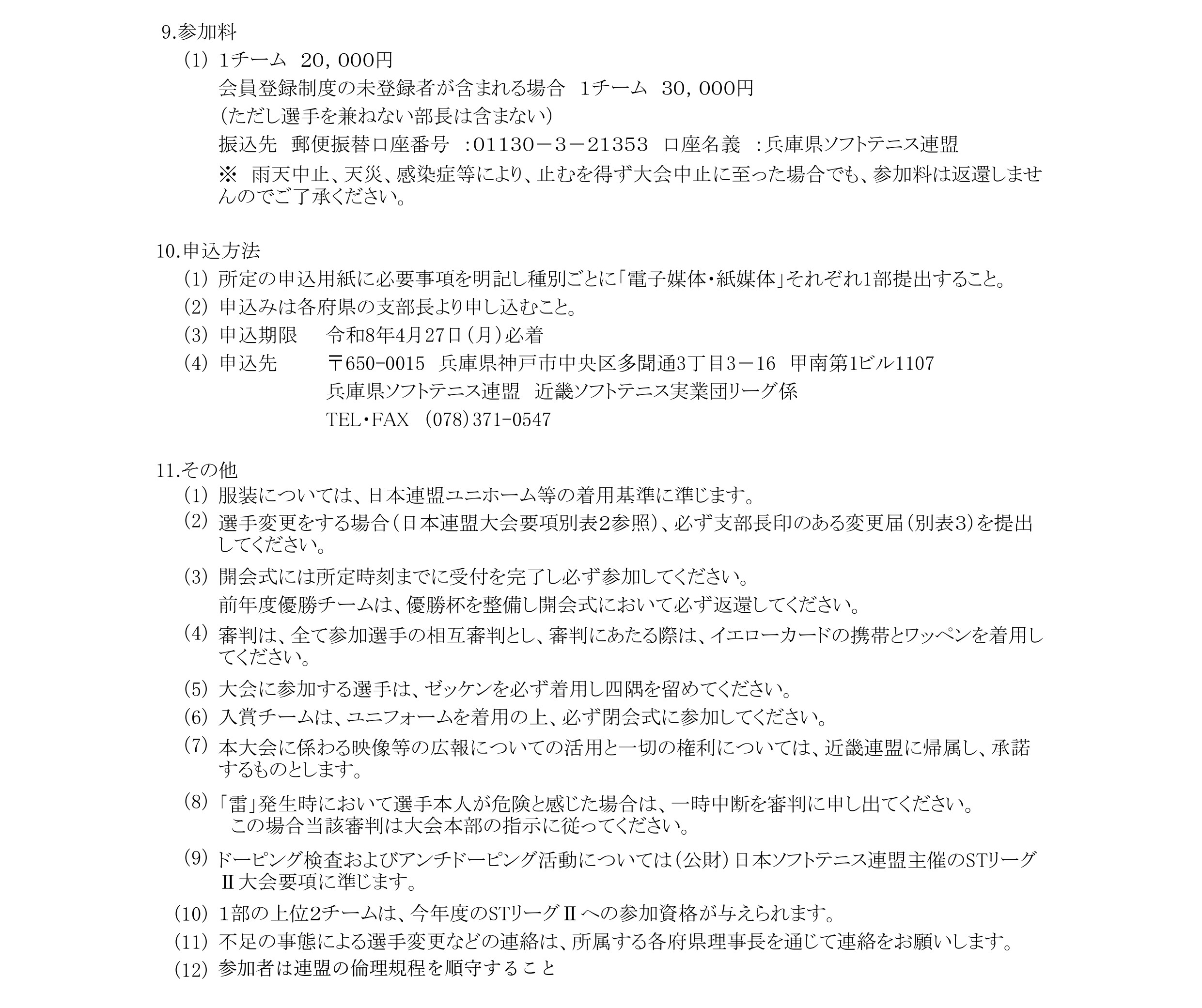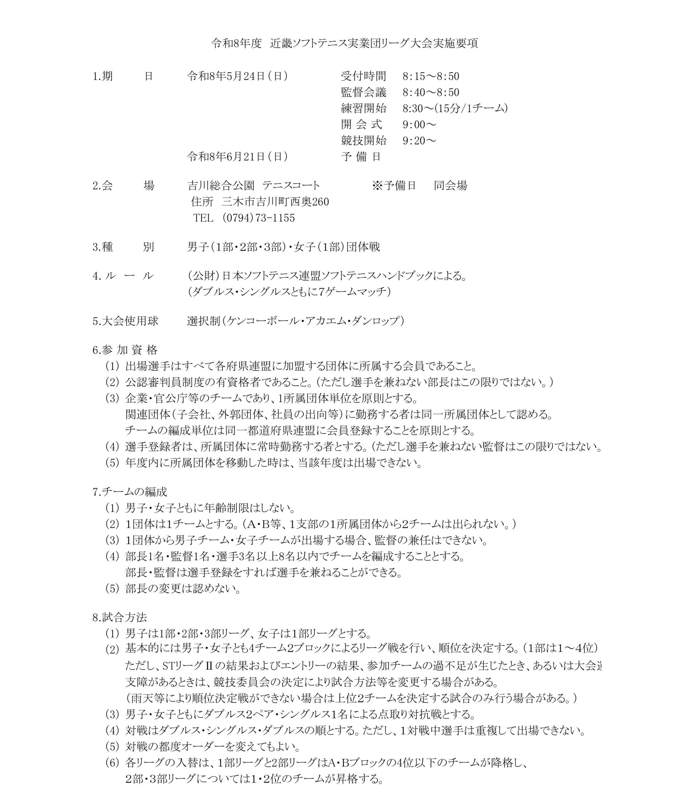 【4/27申込締切】令和8年度 近畿ソフトテニス実業団リーグ大会実施要項 2026年4月3日 最終更新日時 : 2026年4月3日 サイト管理者 R8年度近畿実業団リーグ大会要項 R8年度近畿実業団リーグ大会申込書